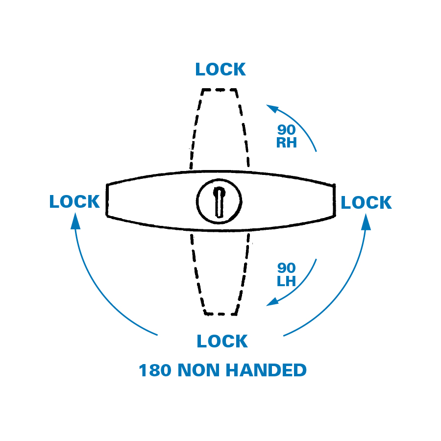 Handles operate through 180° as standard (non-handed). To special order, rotation can be limited to 90° LH (clockwise) or 90° RH (anticlockwise). Handles will lock at each 90°position.