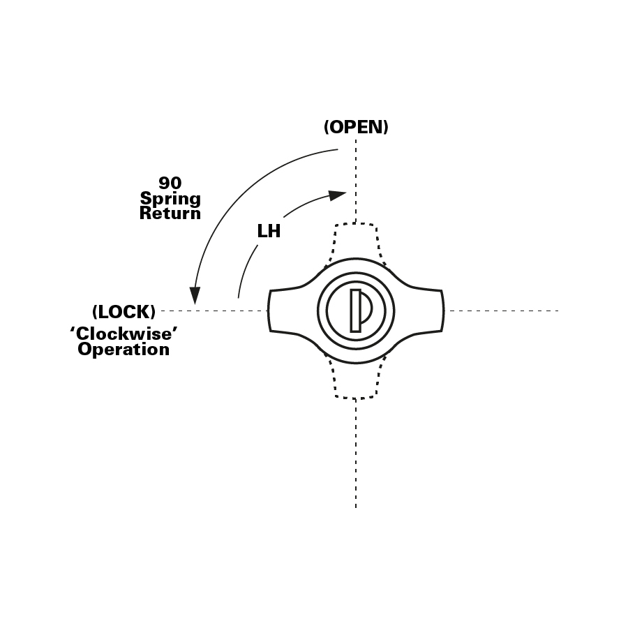 - Turn lock through 90° LH to rotate drive plate and operate attached linkage. Spring returns turnbutton to horizontal position. Key turns through 180° to prevent movement and withdraws in both positions.