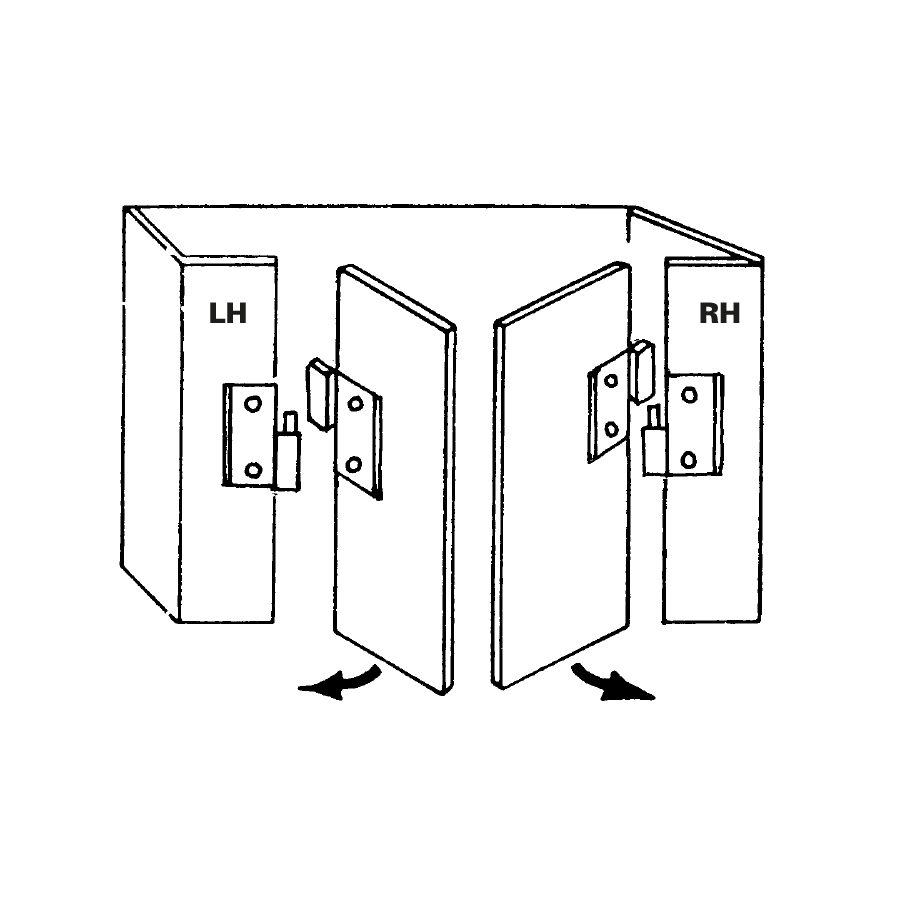 - Doors lift-off fixed pin in bottom half of hinge. Use LH and RH together (opposed) when door is required to be permanently fixed.